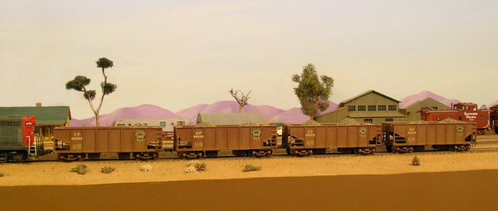 Here are four gravel hopper cars that are used on the LA&SFV; layout to serve the local concrete companies.