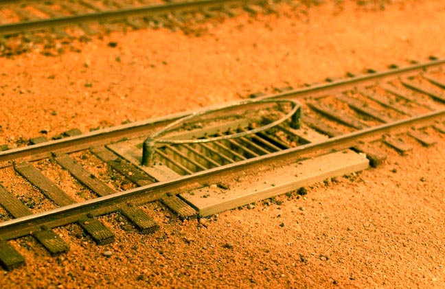 This is the Dump Pit. The plastic ties were cut and removed with the rail still left in place. A 1/4 inch dia. hole was drilled through in the center of the track and a small square rasp file was used to make a “V” shaped pit. A little spackle was spread on the pit sides and sanded, then painted with a concrete color.