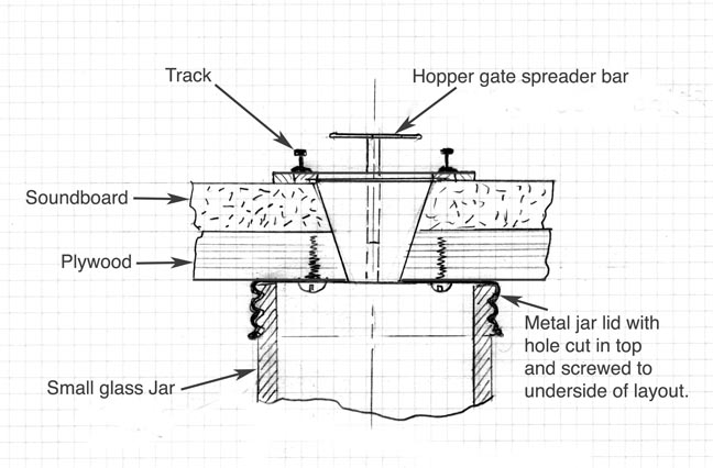 Shown here is a Cross Section of what the Dump Pit looks like. The Hopper Gate Spreader Bar can be pushed down out of the way when the pit is not in use. I cut off the Kadee uncoupling pins on these cars so they do not interfear with the Hopper Gate Spreader Bar.