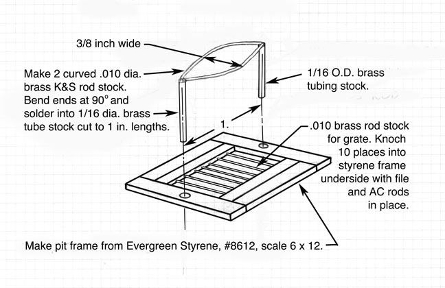 After the styrene frame is made and painted a concrete color, set in place under the rails. Drill two a 1/16 inch dia. holes into the layout as shown for the Hopper Gate Spreader Bar. There will be enough friction to hold the Hopper Gate Spreader Bar in the up position when in use.