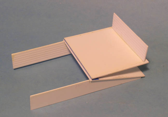 The size of the concrete loading dock is 15 feet wide and 30 feet long. The ramp is 15 feet long. The prototype concrete docks used wood boards. Evergreen styrene V-Groove sheet of .040 thick were cut to be 5 scale feet wide, this includes an extra 1/8″ for the height of the flex track. On the inside of the form will be the mortar lines of the V-Grooved sheet having simulated boards 9-10 inches wide. This will be seen in the finished concrete model with the concrete forming extended joint lines in the boards. Smooth sheet styrene is used to make the deck and the ramp.