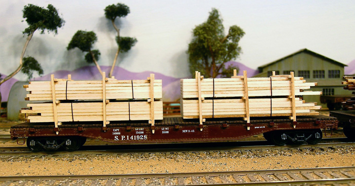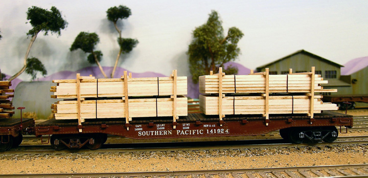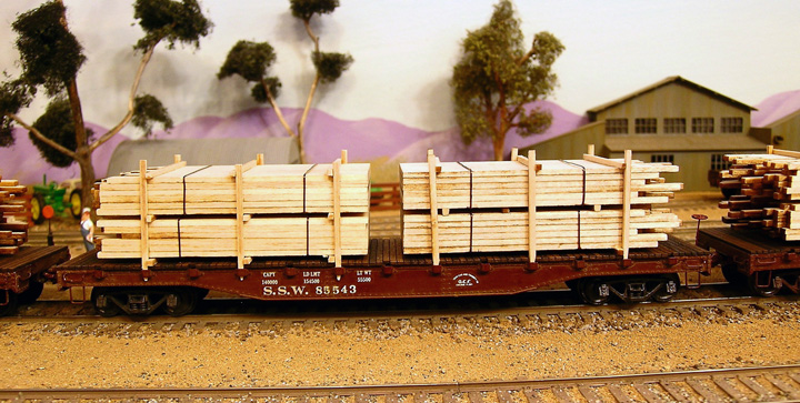 These three finished flat cars have lumber loads were built up with laser cut wood. Photos shown below are close up views of Lumber loaded cars. The loads are easily removable.