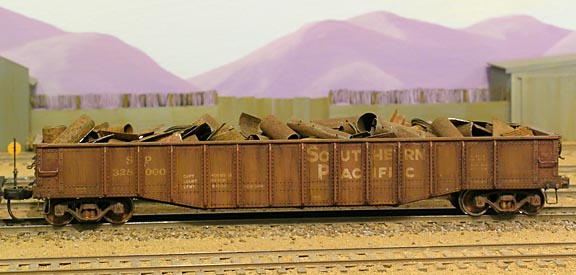 SP 50′ Gondola. Athearn car with added grab irons and stirrup steps, wood stain weathering 40 years ago. This is one of four gondolas used for scarp iron service.