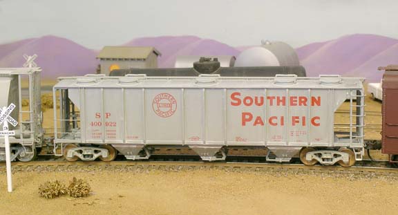 50′ Standard Hopper Car This is one of the latest cars from Athearn with scale grab irons and thin metal roof walk. I weathered this car using a wash of white Latex indoor paint to look like it has been hauling potash. You may notice that I have sprung trucks on most of my rolling stock, this is because they seem to track better.