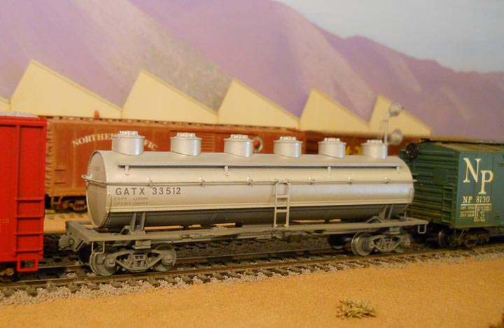 Tank Car. This old Athearn car was weathered with a gray wash. It hauls fuel oil to an orchard smug pot fuel destrubitor.