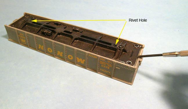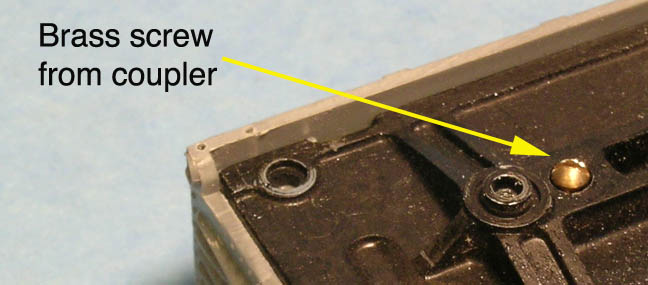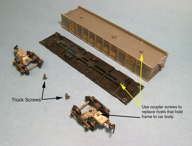 After the trucks and frame are removed, use the small brass screw that holds the coupler to the Tyco truck to replace the rivets. It will screw it in to the plastic body hole without rethreading the hole. Also save the Truck Screws (see picture) that will replace the Tyco trucks if you wish to use Kadee sprung trucks, the screw fits into the Kadee bolster to the metal under frame. If you are using an Athearn type plastic truck, the bolster hole will need enlarging just a little by using a round file so to fit over the frame shoulder hole.
