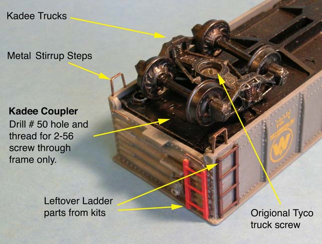 First is to remove the plastic grab irons and end ladders from the cars plastic body with an Xacto knife. The stirrup steps were also cut off to be flush with the underbody and new holes drilled for metal ones.
