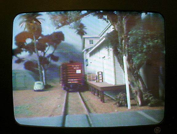 I put together these four pictures off my 13 inch, TV monitor showing the Mini Cam in operation. When visiting engineers run on the layout, I work as the brakeman operating turnouts and uncoupling cars. The engineer can get the full effect at track view.
