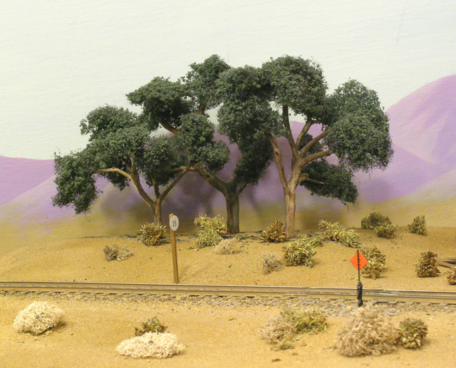 Eucalyptus trees on my layout are made from dead Manzanita branches and Petite Pines Northern tree matting material. If you live or can visit areas of the west where Manzanita grows, a few hours finding and picking the dead branches will end up being a lot of Eucalyptus trees for your layout.