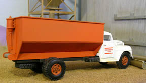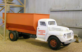 The feed truck was built up using an HO metal model already lettered for Purina. I removed the truck bed that came with the model and built my own. This type of bed is typical to feed trucks that are loaded under a bin and unloaded by the use of a conveyor that is operated by a power take-off on the transmission. I added a piston to pull up the back gate so the conveyor can unload. Still need to add a few little details like tail lights, mud flaps and mirrors.
