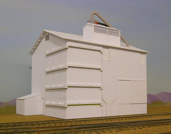 The finished warehouse end. The taller milling structure and the warehouse are modeled as seperate units and placed together, this makes it easier to paint them later. I built up the windows using Evergreen styrene, 1″X 2″scale lumber.