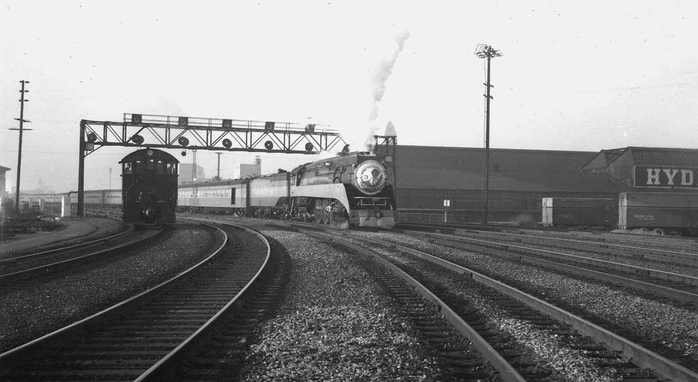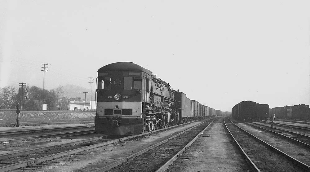 Engine 4263 and crew await their departure, no train number in the number boards. Seen at the far right is a Caboose storage track.