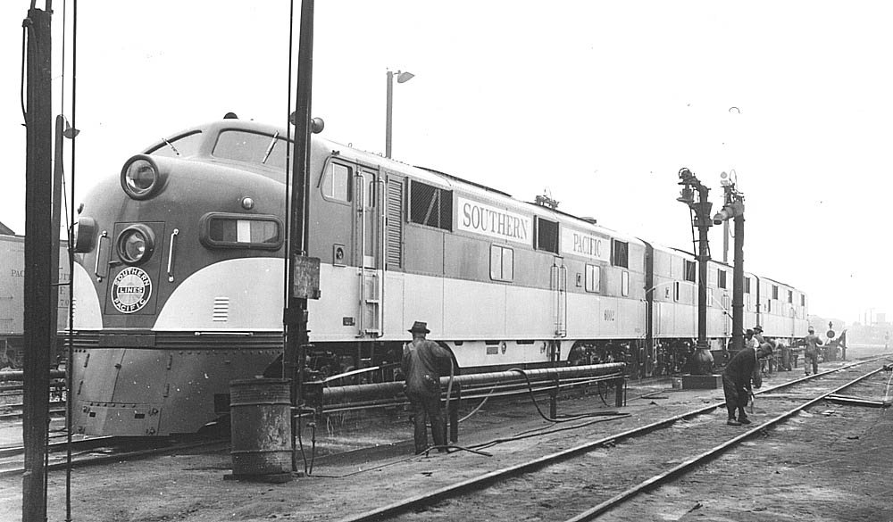 Brand new EMD, E-7’s, Golden State passenger train power shares fueling facilities with steam before diesel facilities are built.