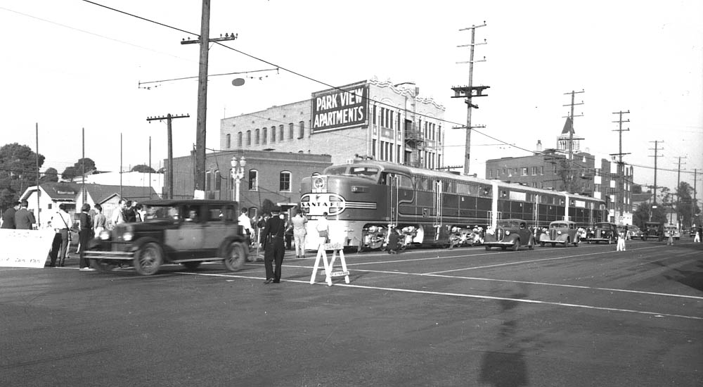 Santa Fe displays their new Passenger PA units during October 8-9, 1946 on Exposition Boulevard, Pacific Electric tracks.