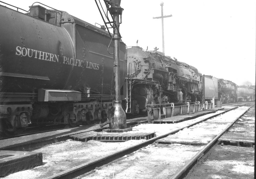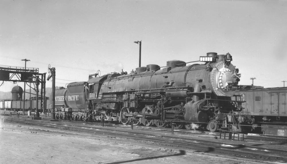 SP Locomotive #5004 and its crew prepare to take water and fuel oil. Note the sawdust burner in the background, part of the PFE lumber mill in their repair yard.