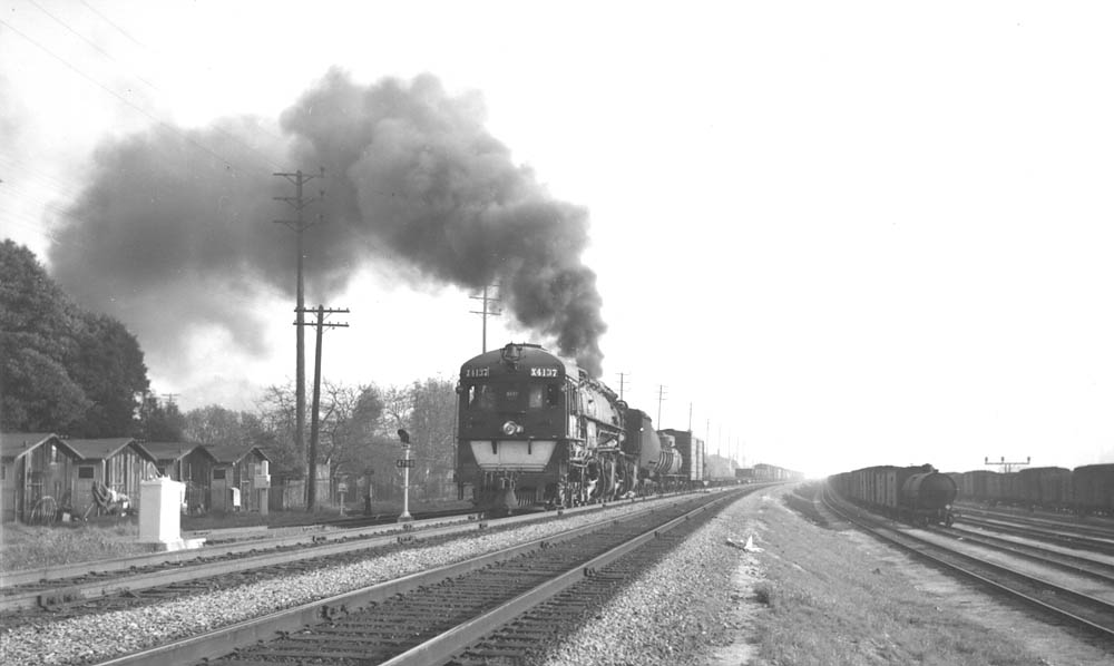 Extra 4137 heads its freight train Westbound on the #1 track passing Taylor Yard.